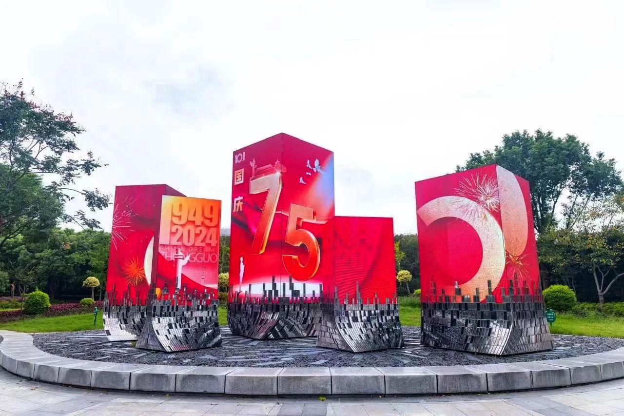 位于經(jīng)開區(qū)立德道的無錫市民中心地鐵口旁,中間大氣端莊的金色數(shù)字“75”,以上海三思異形LED顯示、裸眼3D等創(chuàng)新技術(shù),搭配酷炫的3D剪紙翻頁、數(shù)字浮雕效果,記錄著祖國母親走過的歲月。