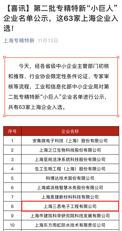 去年11月13日,上海三思還入選工業(yè)和信息化部辦公廳“第二批專精特新小巨人企業(yè)培育”名單,進一步推動企業(yè)高質量發(fā)展,提高企業(yè)專業(yè)化能力和水平。