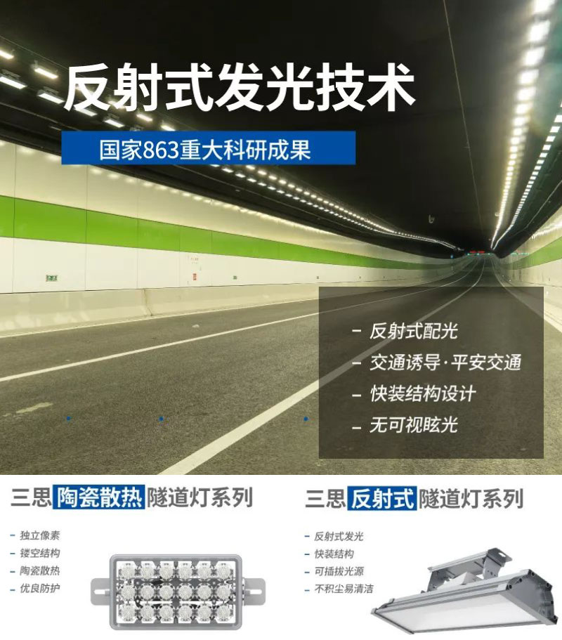 三思應用自主研制的LED反射式照明隧道燈,通過專業地隧道照明設計方案,很好地解決了隧道照明的斑馬線、配光不佳等照明難題,并兼顧舒適照明、簡易安裝、簡潔美觀、交通誘導等要求。