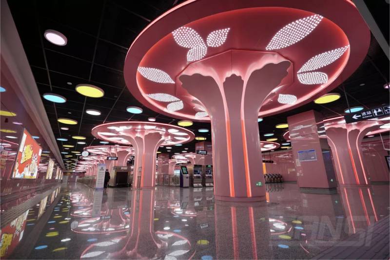 以錢湖南路站為例,該站以“繁花綻放”為主題,支柱造型設(shè)計為寧波市市花山茶花,寓意莘莘學子活力四射的精神面貌。三思發(fā)揮強大的定制能力,打造舒適而又富有特色的LED照明環(huán)境,造型獨特的異形燈在起到照明作用的同時,又很好地改善了地下空間原本沉悶的氛圍,增加了許多趣味性和藝術(shù)性,讓整個空間變得更加明亮又浪漫。