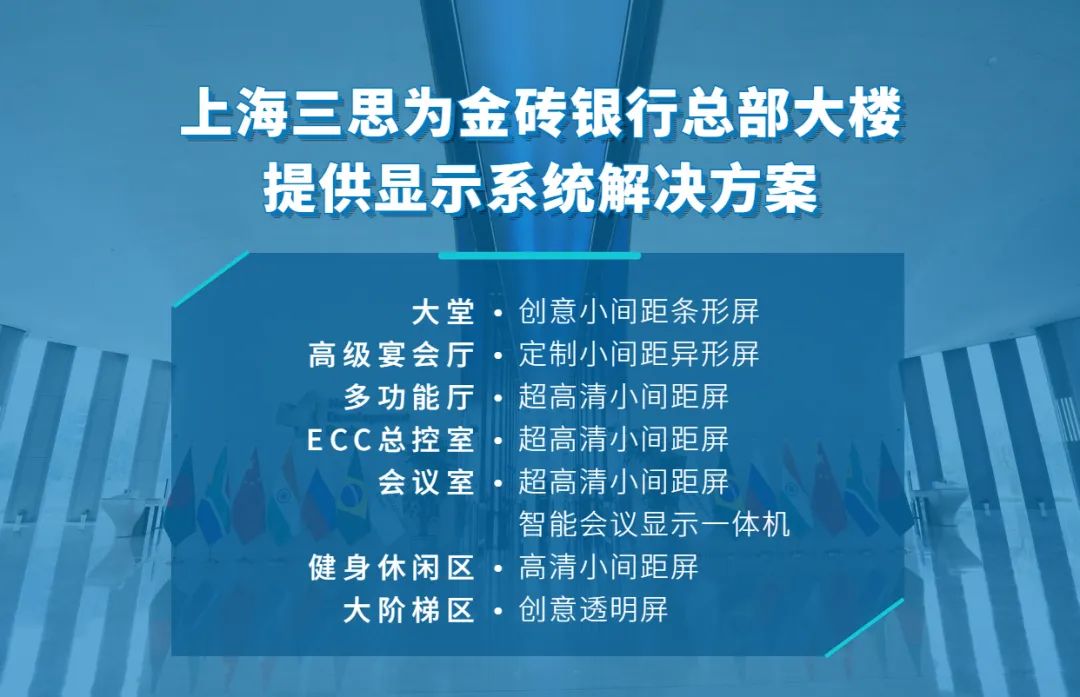 上海三思也通過高端定制能力、優質產品和系統實力,為金磚銀行總部大樓打造一整套超國際水平的顯示系統解決方案,呈現一個綠色、科技、智能、高效的國際化空間,進一步助力上海國際金融中心的建設。