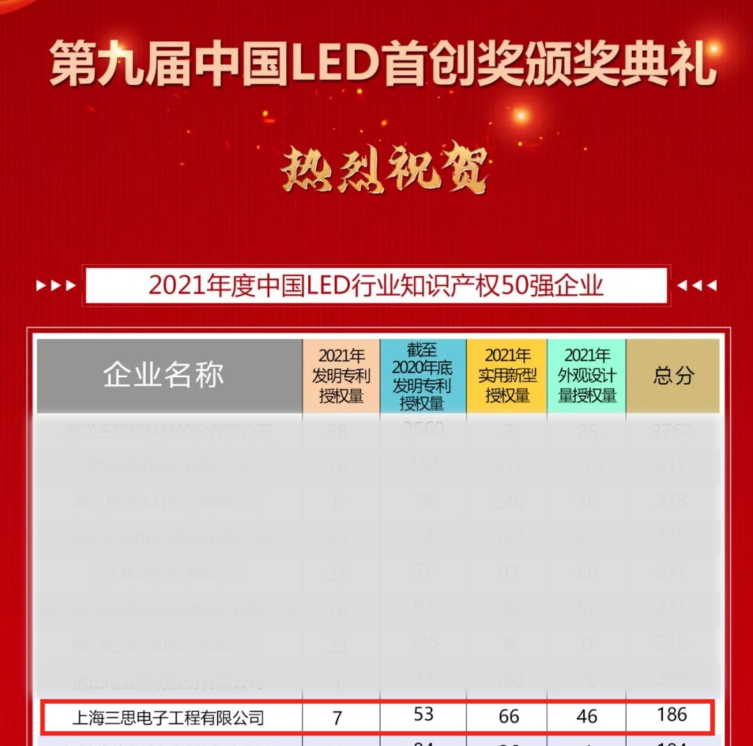 2022年8月3日,第九屆中國(guó)LED首創(chuàng)大會(huì)在廣州市廣交會(huì)展館隆重舉行。大會(huì)上發(fā)布了“第九屆中國(guó)LED首創(chuàng)獎(jiǎng)2021年度中國(guó)LED行業(yè)營(yíng)收50強(qiáng)、知識(shí)產(chǎn)權(quán)50強(qiáng)榜單”,上海三思強(qiáng)勢(shì)入圍前十強(qiáng),獲評(píng)“2021年度中國(guó)LED行業(yè)知識(shí)產(chǎn)權(quán)50強(qiáng)企業(yè)”稱號(hào)。