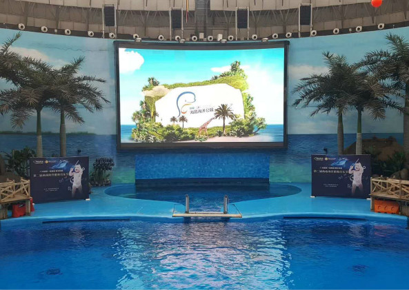 成都海昌海洋公園鯨豚表演館里,最引人注目的便是由三思新升級改造的LED顯示屏。這款屏高8.82米,寬14.4米,點間距為5mm,顯示屏面積足足達127平方米,讓游客即使位于邊角位置,也能清晰地看到白鯨和海豚的各種精彩瞬間。
