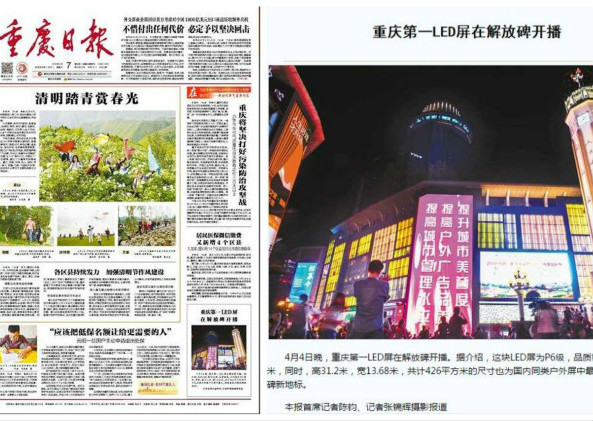 2018年4月4日晚8點08分,“重慶第一LED屏”在解放碑全新升級亮屏成功。(“重慶第一LED屏”引用自《重慶日報》) 這塊屏選用戶外高品質、高穩...