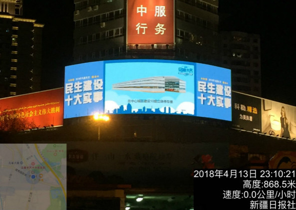 2018年4月13日,新疆日報社大樓上的弧形LED廣告屏正式點亮。該屏為上海三思XL系列室外全彩屏,點間距為16mm。超過180°的外弧面屏設計,水平視角大于140°,超寬視角提供上佳觀感,三面看去,都能一覽無余